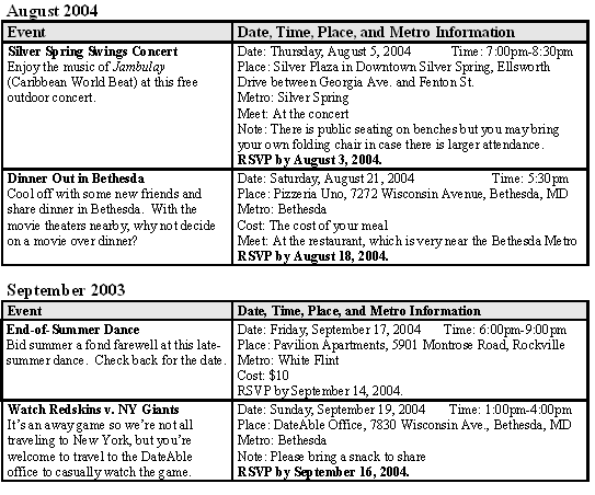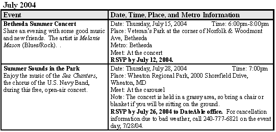 As some of you may know, DateAble is going through some changes. We will still exist but are merging the DateAble Washington membership with DateAble International. This is an exciting time because not only will you have the opportunity to meet people in the Washington, DC area, you have the opportunity to make new friends from around the country. DateAble Washington held a Town Meeting on June 24, 2004 to outline the new procedures and membership features. Please read the minutes from the meeting in this issue of the newsletter. Of course, if you have any questions, please contact me at the DateAble office or by email.